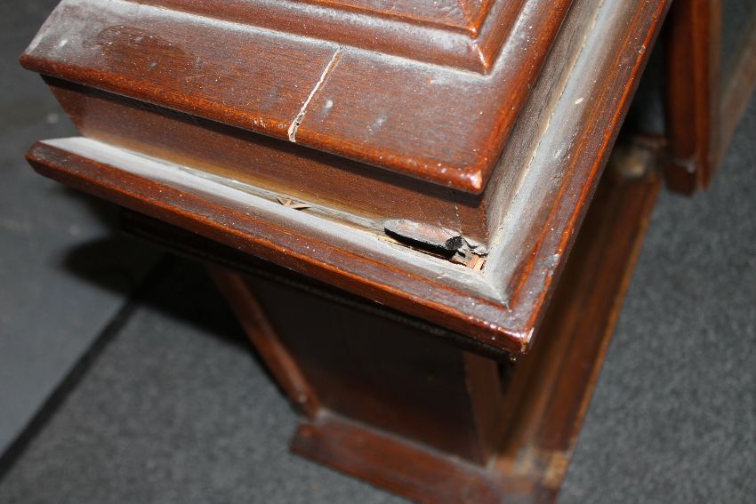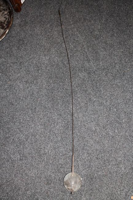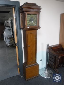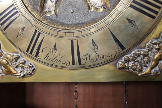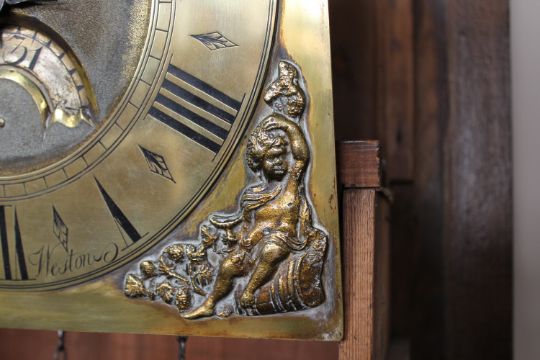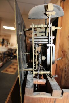 10" dial. The clock is 204cm high. The door requires reattaching to the hood. The hood has several splits or gaps between the mouldings. The dial does not sit level on the base board. I cannot see any woodworm. Movement dirty. I found a note within the hood providing some information on the maker, see additional images.