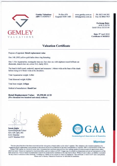 A 14ct yellow gold aquamarine and diamond ring, the rectangular, step-cut, light-blue aquamarine weighing 1.15 carat, within a border of eighteen brilliant-cut diamonds with a total weight of 0.25 carat, of SI2-I clarity and H-J colour, with certification, size K
