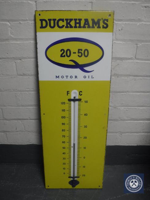 A mid 20th century Duckhams Motor Oil enamelled sign with thermometer