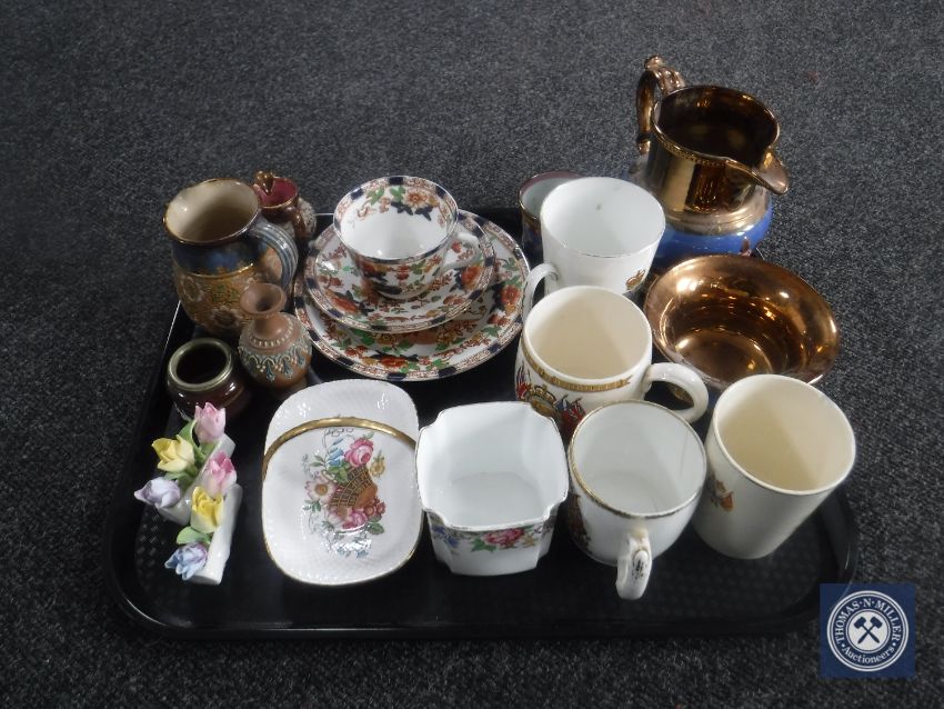 A tray of commemorative mugs and beakers, copper lustre china, Spode Cabinet Collection basket, Victorian china trio, Royal Doulton stoneware jug and miniature vase etc