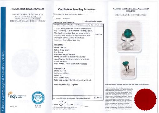 A 14ct white gold emerald and diamond ring, the oval-cut, deep-green emerald weighing 2.36 carats in a claw setting, set with six brilliant-cut diamonds weighing 0.17 carat in total, of I1-I3 clarity and G colour, with certification, size L