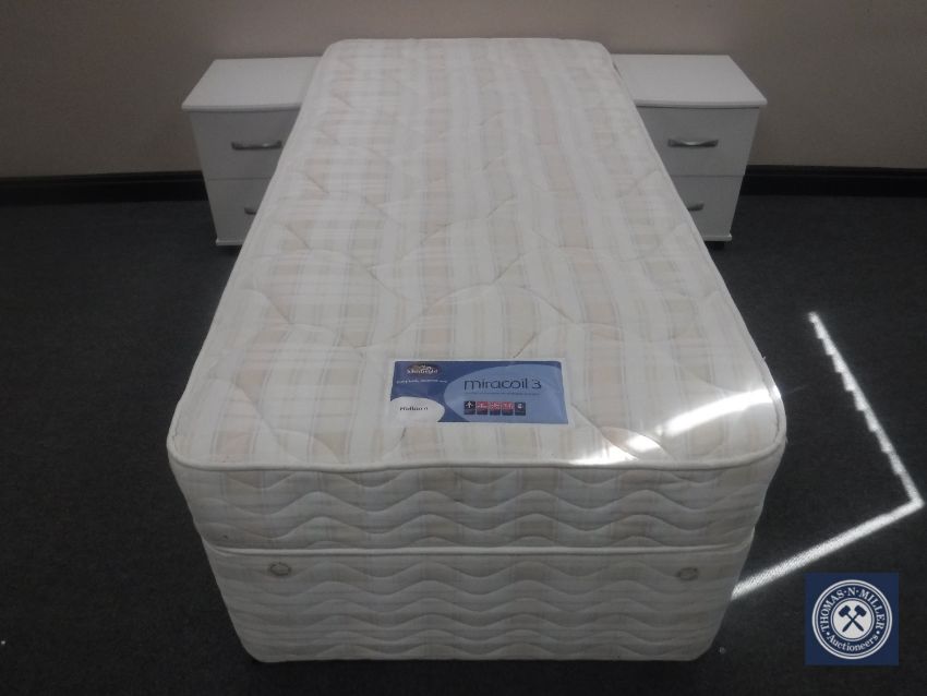 A Silentnight Miracoil 3' storage divan and mattress and a pair of bedside chests