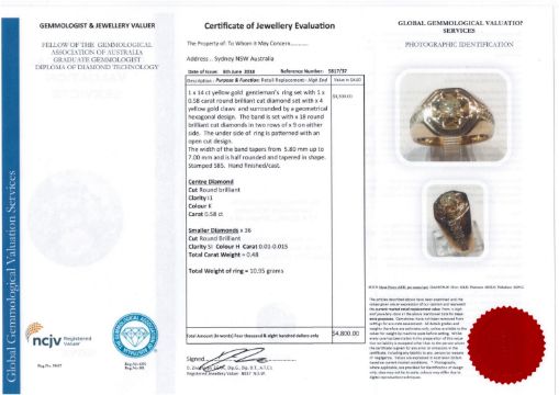 A 14ct yellow gold gent's signet ring, the central brilliant-cut diamond weighing 0.58 carat, clarity I1 and colour K, the shoulders set with thirty-six brilliant-cut diamonds weighing 0.48 carat in total, of SI clarity and H colour, with certification, size T