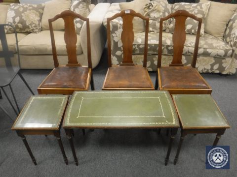 Three walnut dining chairs and a nest of tables