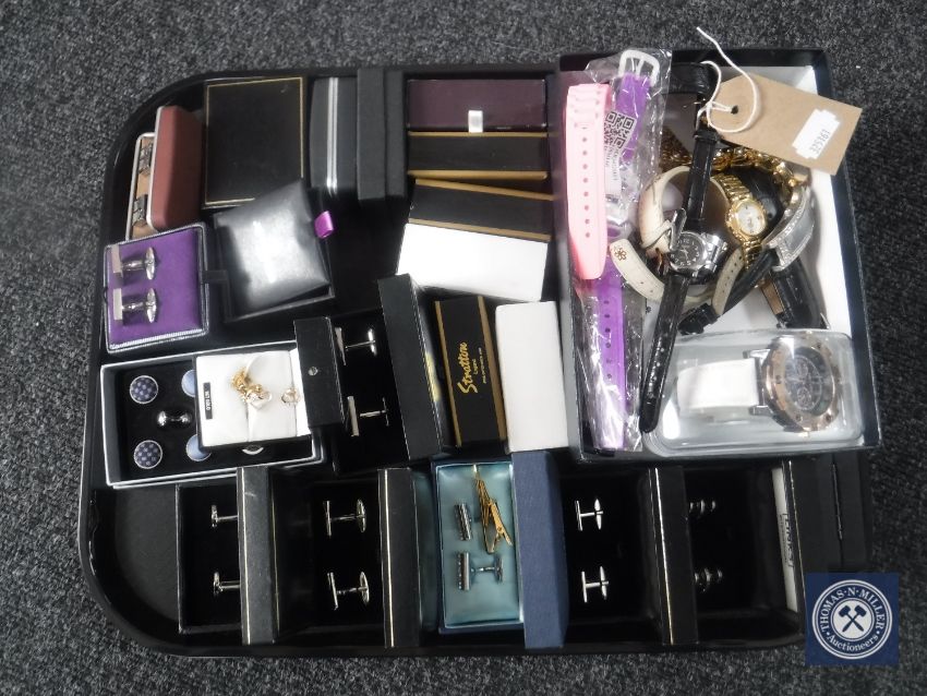 A tray of a large collection of boxed cuff links including Jeff Banks, assorted wrist watches, gold plated pendant on chain and a pair of earrings