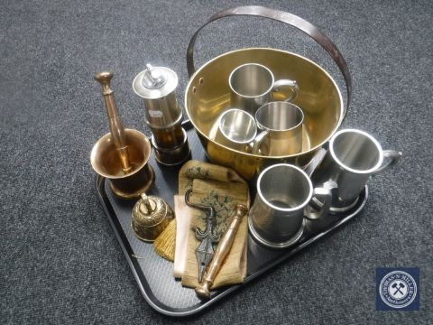 A tray of brass jam pan, pestle and mortar, tankards, novelty cigarette holder etc