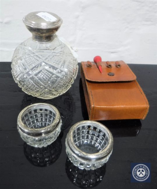 A cut glass silver lidded perfume bottle, a pair of silver rimmed salts and a hip flask in a leather pouch