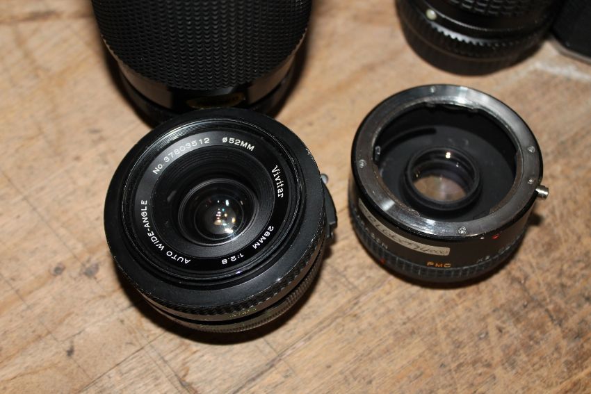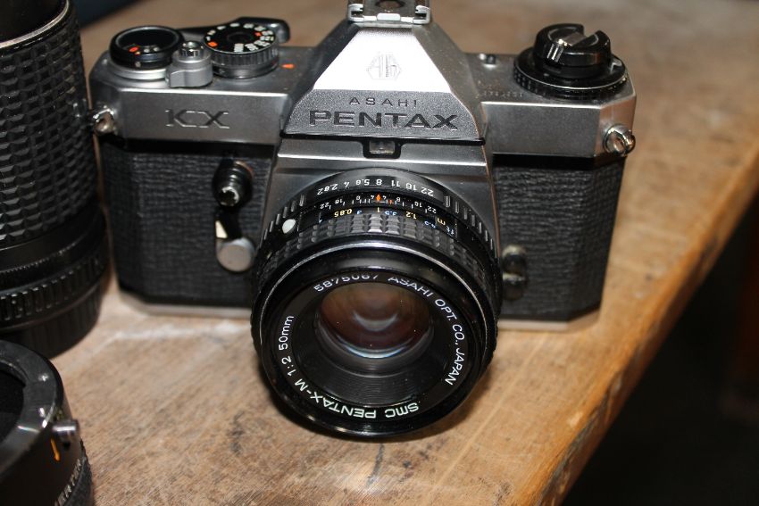 A camera case containing a Pentax KX camera with four lenses CONDITION REPORT: The camera has an Asahi SMC Pentax-M 1: 50mm lens.The other lenses are as follows: Vivator 28mm 1:2:8 Auto Wide-Angle 52mm. Vivator Series 1 70-210mm 1:3.5 Macro Focusing Zoom 62mm. Super Paragon X2 Converter. Asahi SMC Pentax 1:3.5/135. See images.