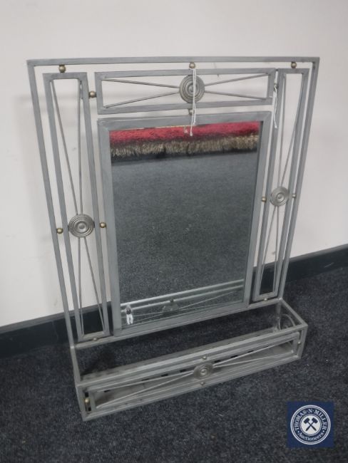 A metal framed mirror with shelf