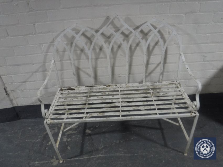 An early 20th century wrought metal two seater arched back garden bench