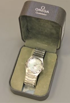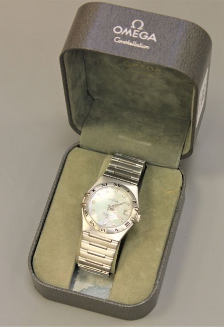 A gent's stainless steel automatic centre seconds calendar wristwatch, Omega, model; Constellation, mother of pearl dial with diamond numerals, case back with Constellation emblem and visible balance wheel, on Omega bracelet with deployant clasp, case 35mm, in Omega box