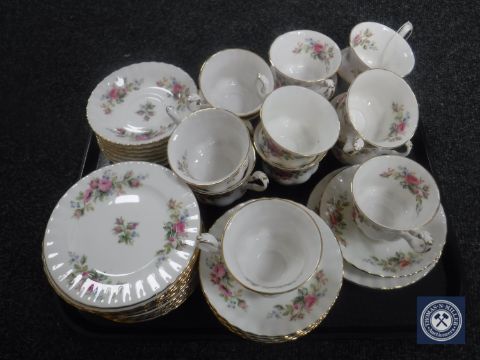 A tray of forty-three pieces of Royal Albert Moss Rose tea china