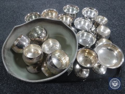 A plated lion mask handle punch bowl, plated wine glasses and goblets