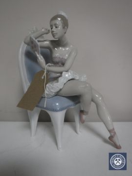 A Lladro figure of a ballerina seated on a chair holding a mirror