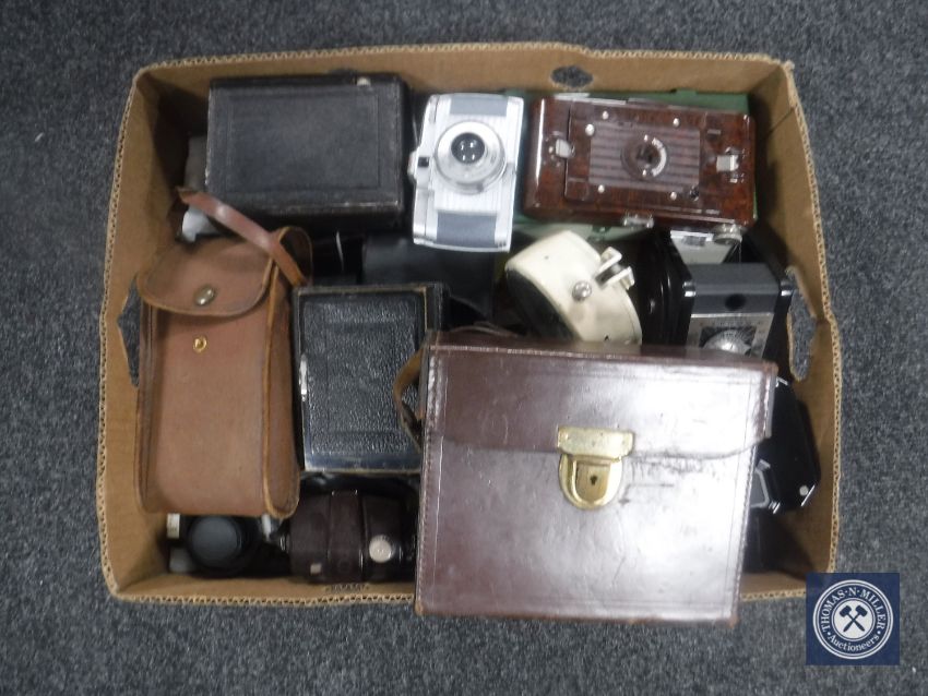 A box containing a collection of vintage folding cameras