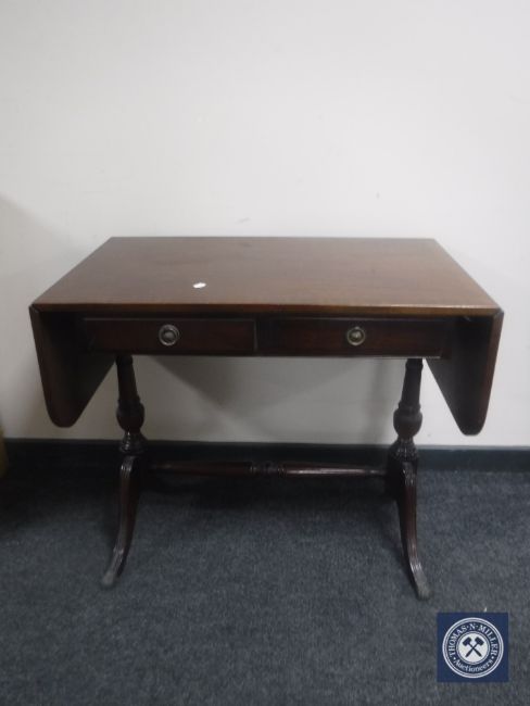 An inlaid mahogany sofa table fitted two drawers