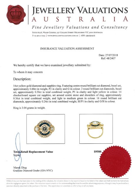 A 14ct yellow gold sapphire and diamond Art Deco style cluster ring, the central brilliant-cut diamond weighing 0.60 carat, clarity P2, colour G, between two brilliant-cut light-yellow diamonds totalling 0.50 carat, of P1 clarity, also with fourteen checkerboard square-cut blue sapphires in channel settings weighing 0.36 carat, within a further sixteen brilliant-cut diamonds weighing 0.24 carat, of SI/P1 clarity and G/H colour, with certification, size J/K