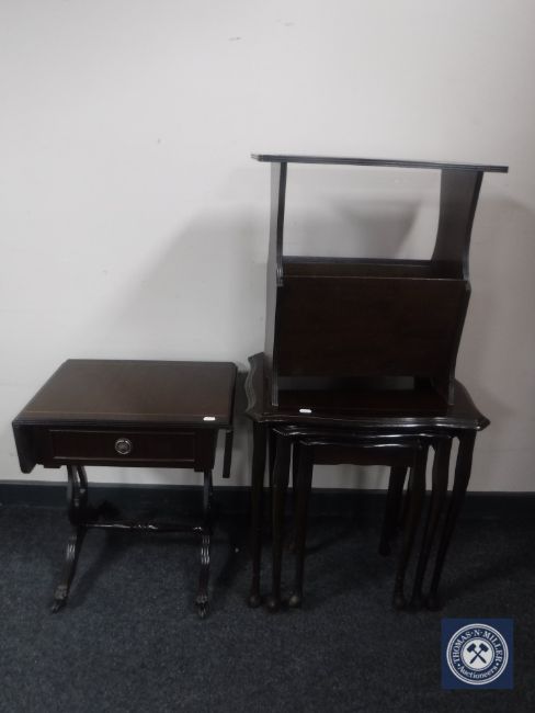 A nest of three inlaid mahogany tables together with an inlaid mahogany sofa table and a mahogany leather topped magazine rack