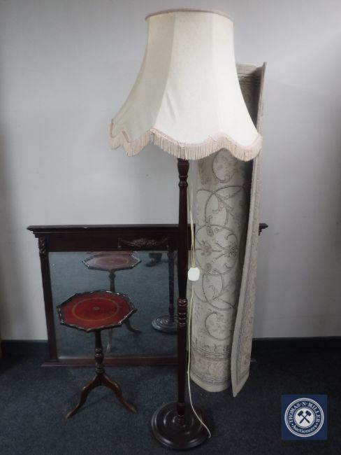 A mahogany framed overmantel mirror together with a contemporary rug, wine table and a standard lamp with shade