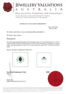 An 18ct white gold emerald and diamond ring, the oval-cut medium-green emerald weighing 0.71 carat, within thirty-eight brilliant -cut diamonds in a pave setting, totalling 0.71 carat, of SI/P1 clarity and G/H colour, with certification, size J/K