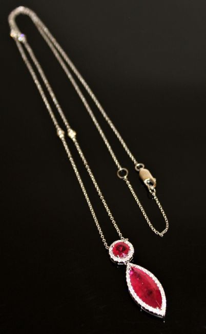 An 18ct white gold ruby and diamond necklace/pendant, a marquise-cut pinkish/red ruby weighing 5.82 carats beneath a round-cut pinkish/red ruby weighing 0.94 carat, with forty-eight brilliant-cut diamonds totalling 0.54 carat, of P1/P2 clarity and F-H colour, with certification
