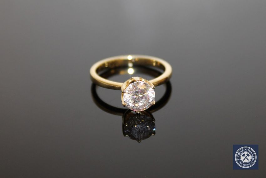 A 14ct yellow gold diamond solitaire ring, the brilliant-cut stone of 1.47 carat, clarity I3 and colour L, in a claw setting, with certification, size M
