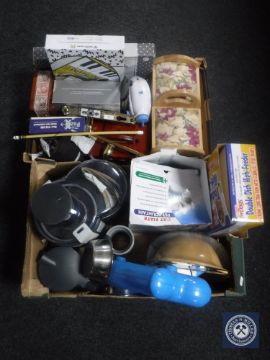 Two boxes containing pet bowls, water fountain, sewing box and miniature sewing machine, kitchen bowls and juicer