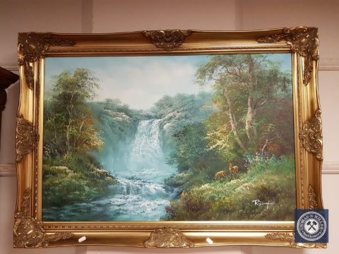 R. Danford (20th century), Forest Waterfall with deer in the foreground, oil on canvas, 90cm by 59cm, signed