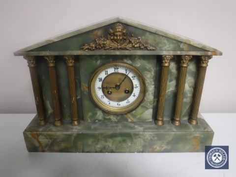 A Victorian onyx mantel clock with brass column supports