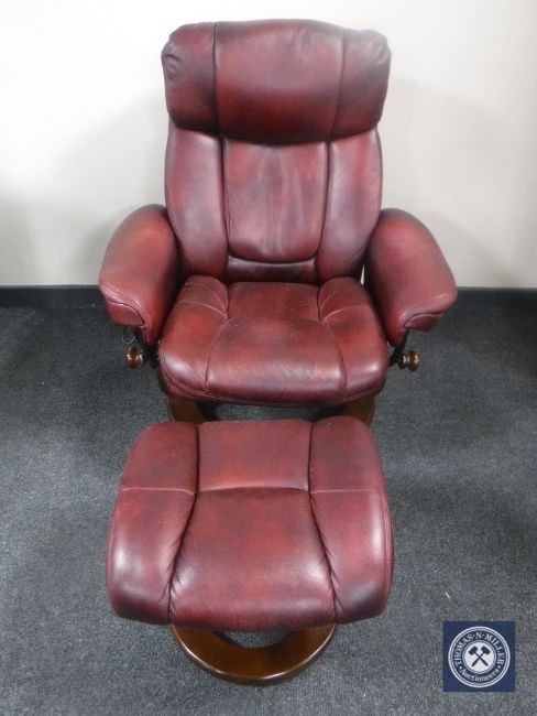 A red leather electric swivel relaxer chair with stool