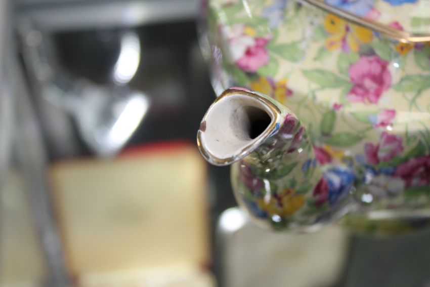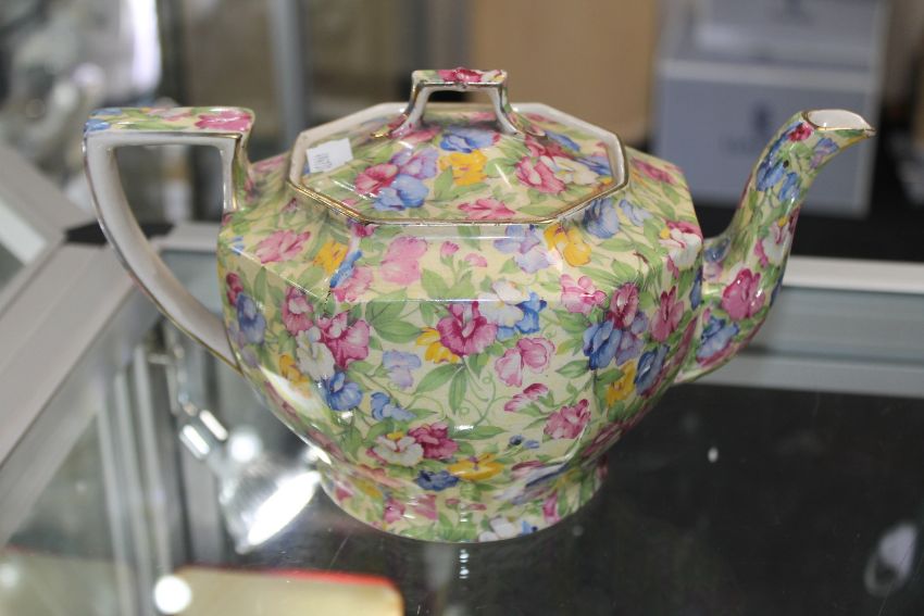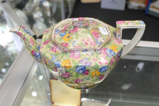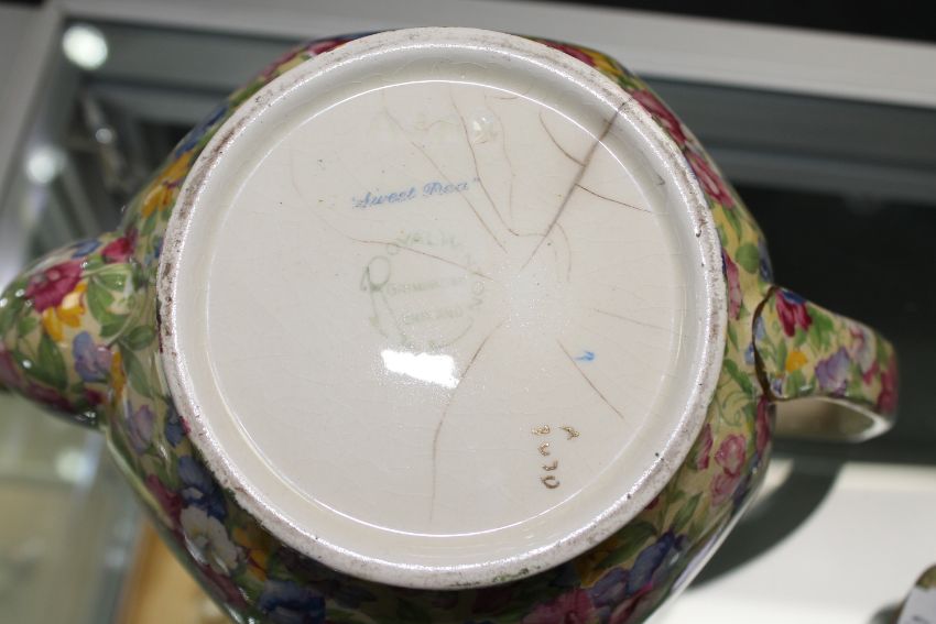 Royal Winton teapot measures 25cm long by 14cm high. Heavily crazed and with hairlines to base. General surface wear. See images.