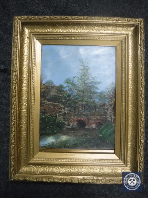 19th century school, two figures on a bridge, oil on canvas