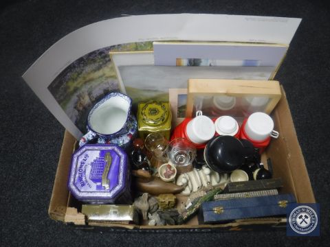A box containing large Ringtons chintz jug, cutlery boxes, figures, signed print, pictures etc