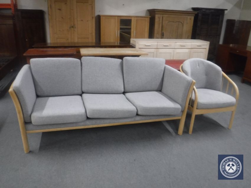 A blonde oak framed three seater settee and armchair with grey cushions
