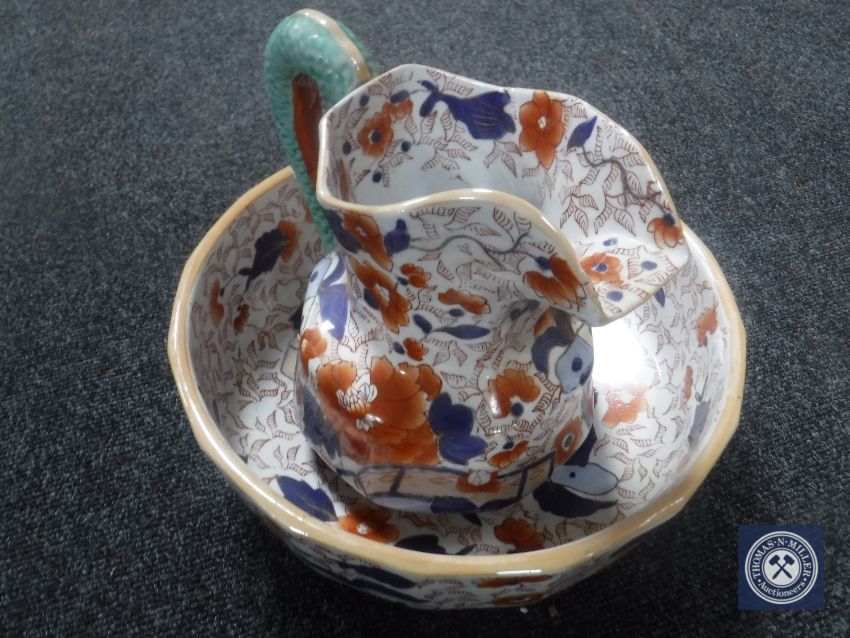 An ironstone jug and basin in Imari colours