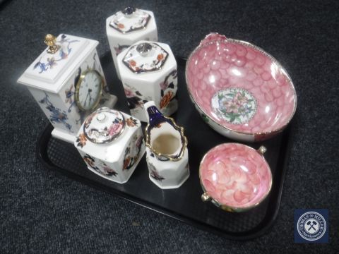 A tray of Masons Mandalay china canisters, mantel clock, two pieces of Maling