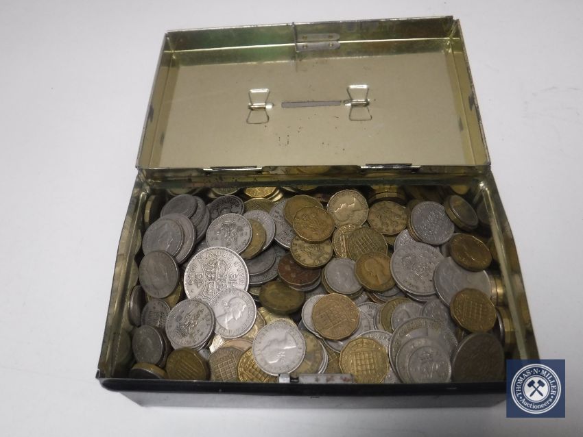 An old money tin containing a quantity of coins, half crowns etc.