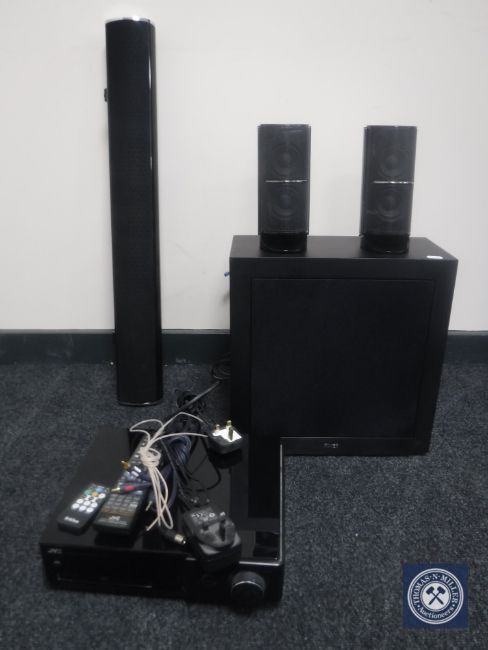 A Kef speaker together with JVC compact component system and surround speakers with remote control