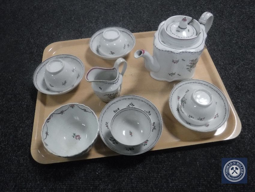 Chip to rim of teapot (thumbnail sized), security chain present on lid, spout un-damaged, puce mark N208, milk jug slight time-staining otherwise good, sugar with general discolouration but in good order, one teabowl with hairline crack, saucers in fair condition.