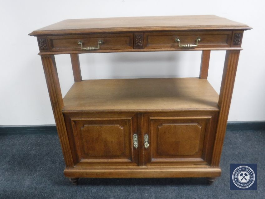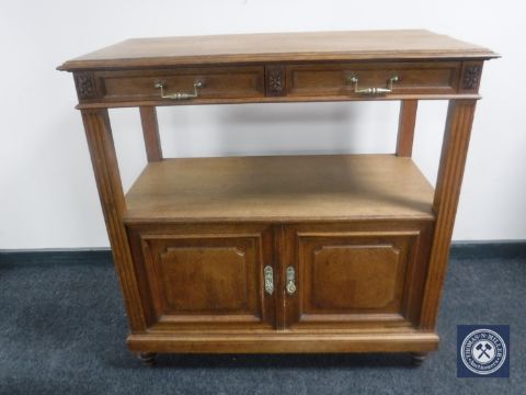 An antique oak serving stand fitted with double cabinet beneath and two drawers
