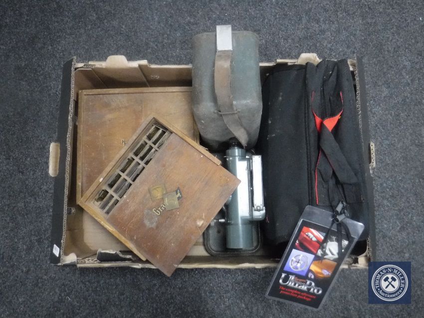 A box of engravers numbers and tools, letters, Hilga and Watts surveyors scope, car protection kit.