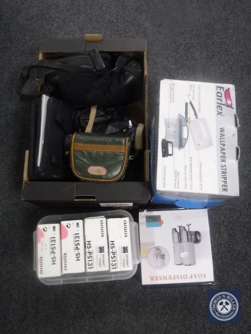 A box containing portable DVD player, electrical items etc