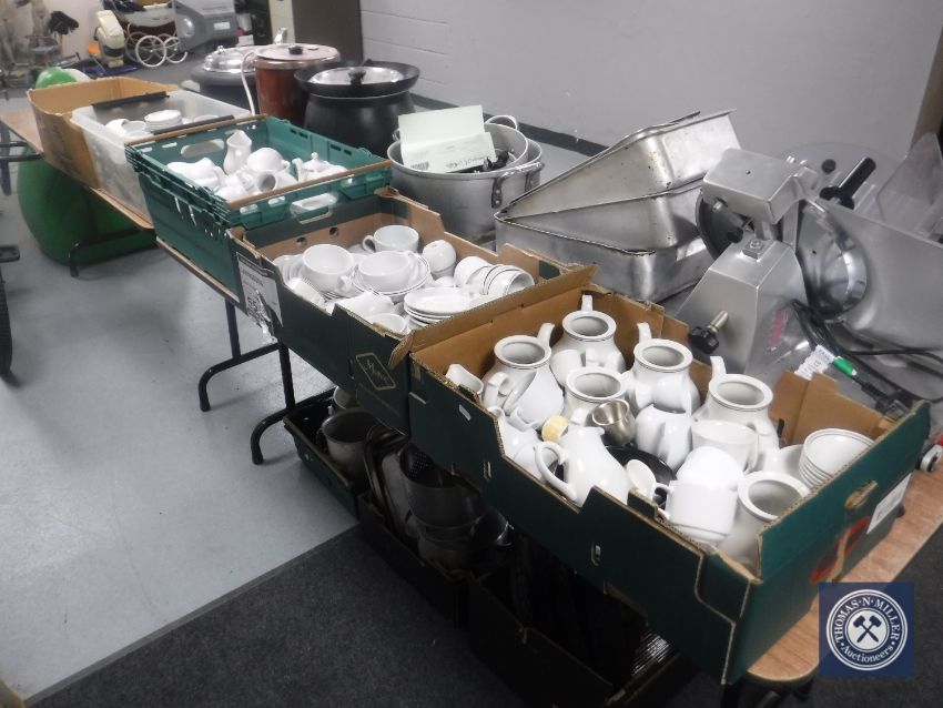 Five boxes containing hotel china, dinner, tea and coffee ware.