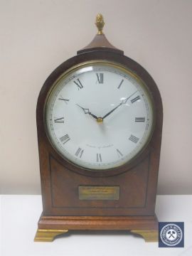 A 20th century inlaid mahogany mantel clock with lion mask handles by Comitti of London on brass feet