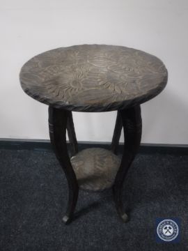 A heavily carved two tier occasional table