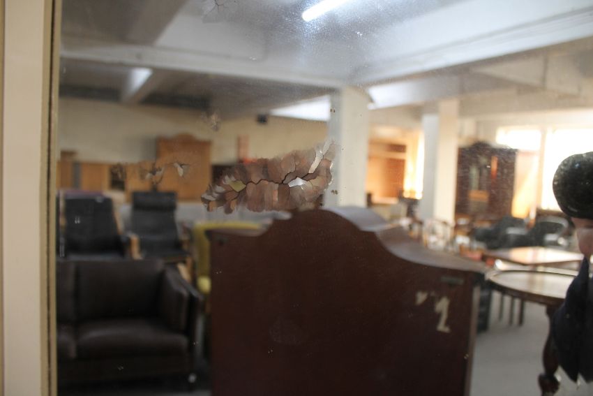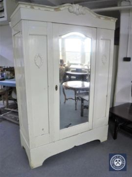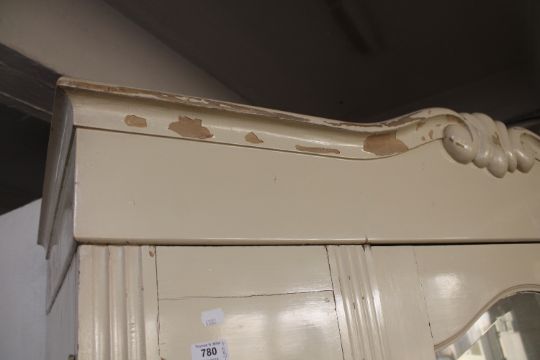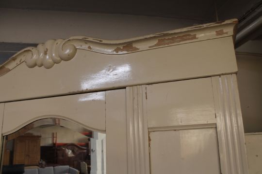 Paint work flaking off, wardrobe generally a little distressed. Aged cracks visible to the mirror backing, the mirror itself is not cracked. See images.