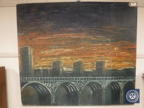 Donald James White : Byker Bridge, oil on panel, signed verso and dated '01, 93 cm x 82 cm, unframed.