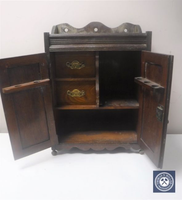 A Victorian oak double door smoker's cabinet with carved panel doors
