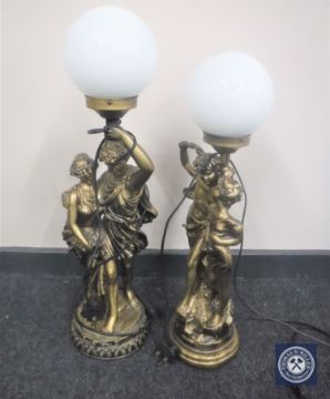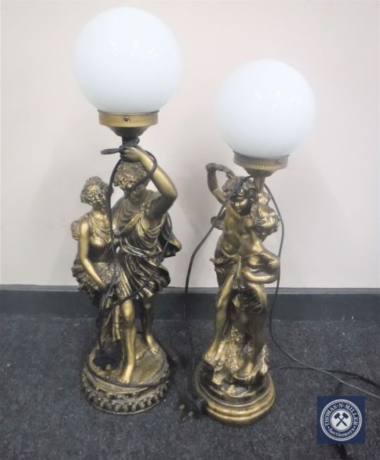 A pair of contemporary gilt table lamps modelled as lovers. (2)
