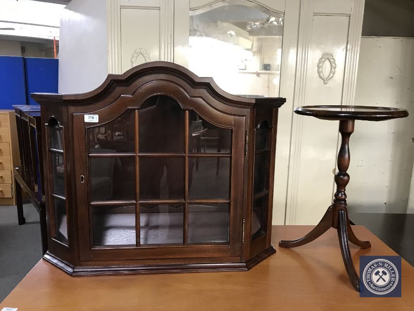 A mahogany glazed door wall mounted curio cabinet and a wine table